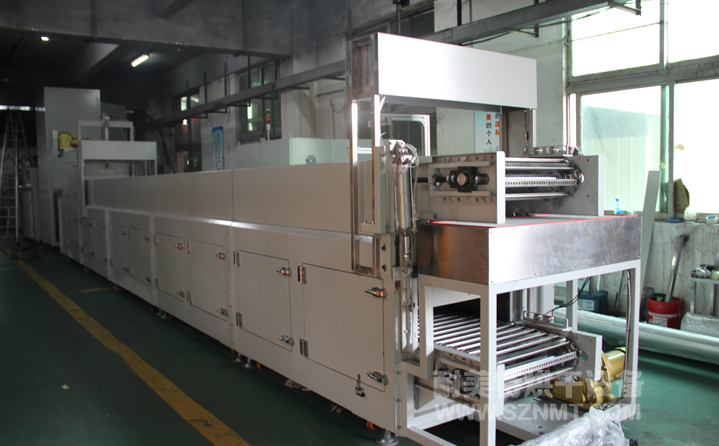 生產(chǎn)流程:1.治具到達(dá)上件工位→→→2.機(jī)械手取件放置→→→3.進(jìn)烤爐升溫階段(速度溫度均可調(diào))→→→4.退火階段(速度溫度均可調(diào))→→→5.下風(fēng)冷卻(2-5分鐘可調(diào))→→→6.治具到達(dá)下件工位→→→7.治具空走返回上件工位;